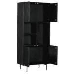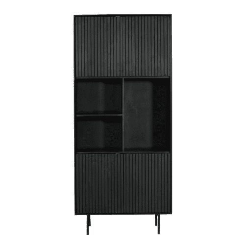 Vakkenkast ‘Madison’ is gemaakt van mangohout. Het metalen frame is afgewerkt met een zwarte lak. Dit model is voorzien van vier deur en drie openvakken. De deuren zijn voorzien van een verticaal lattenpatroon en is afgewerkt met een zwarte lak.