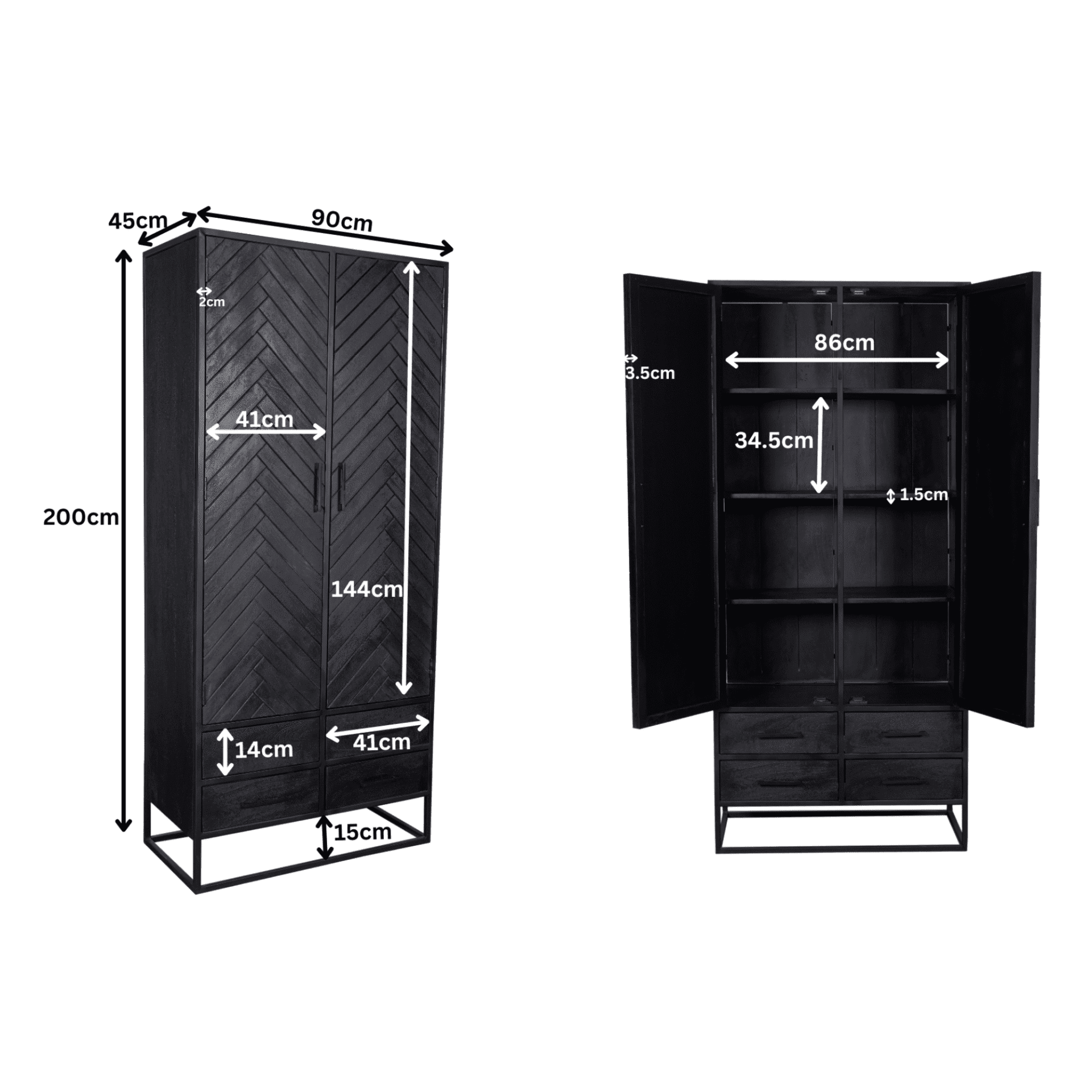Kabinet kast ‘New York’ is gemaakt van massief mangohout. De kabinet kast heeft twee deuren en vier lades. Achter de twee lange deuren vind je nog drie extra legplanken. Het massieve mangohout is gezandstraald en behandeld met een zwarte lak. Het hout is ingelegd in een visgraatpatroon. Het zwart metalen frame en de metalen handgrepen zijn afgewerkt met een zwarte lak.