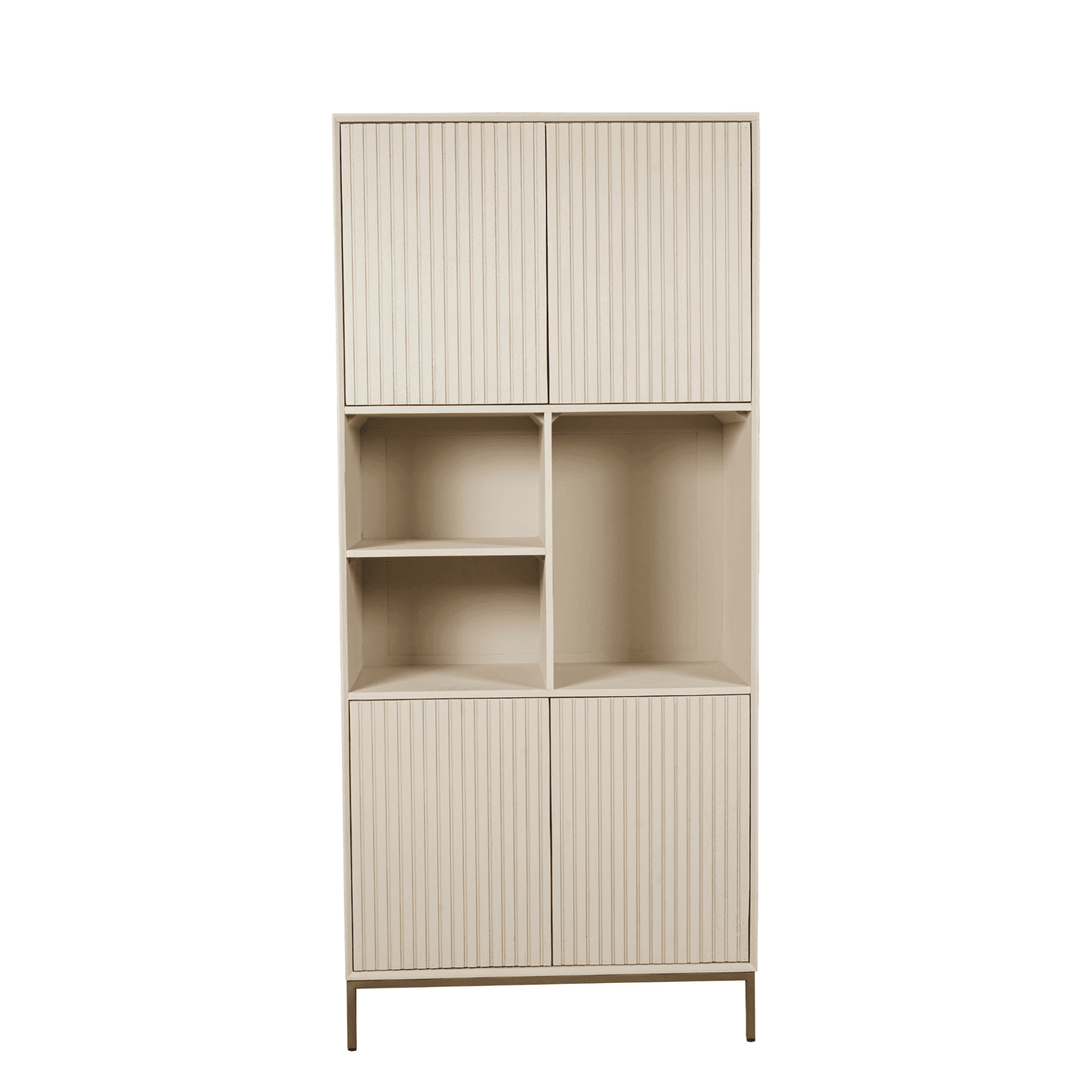 De vakkenkast Madison Sand is gemaakt van licht gezandstraald mangohout en afgewerkt met een verfijnde sand finish. Het metalen frame met een stijlvolle bronzen finish biedt een modern accent. Dit model beschikt over drie open vakken en vier deuren, elk voorzien van een verticaal lattenpatroon.