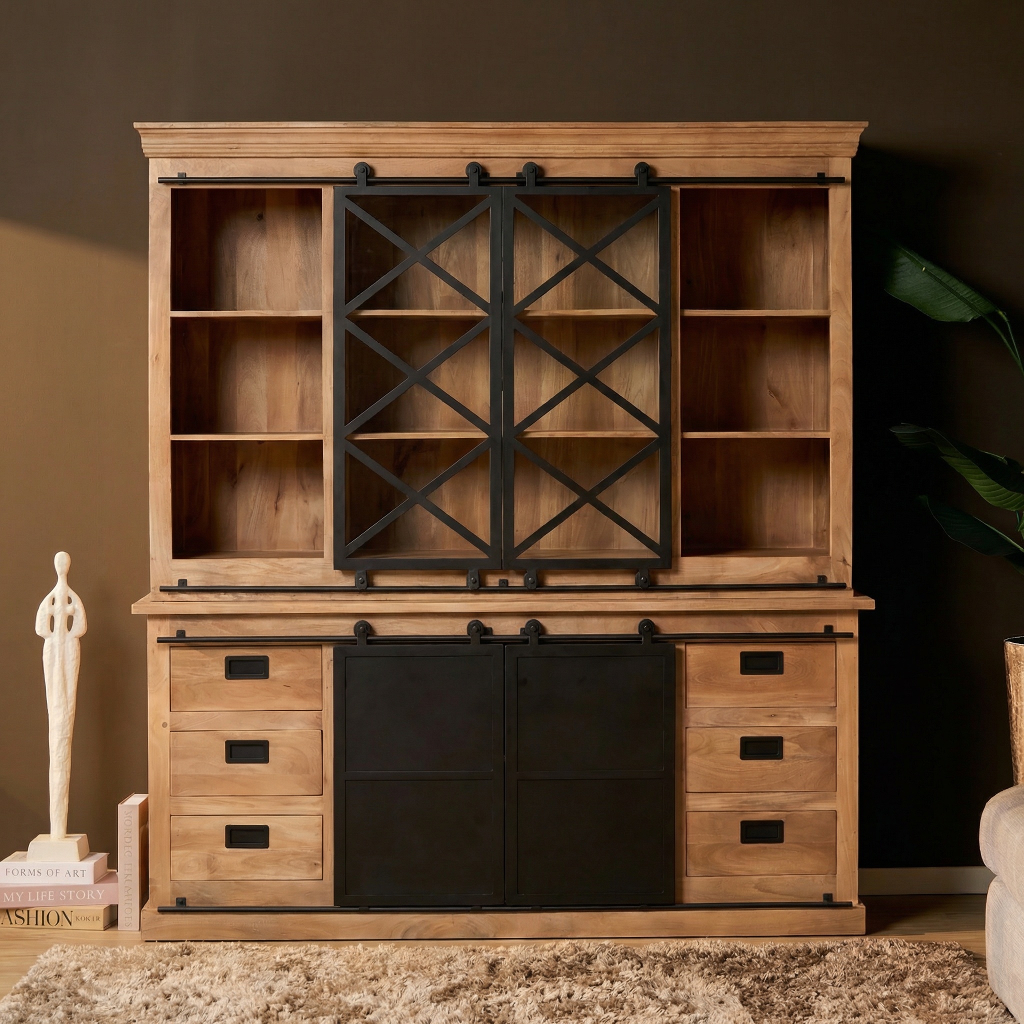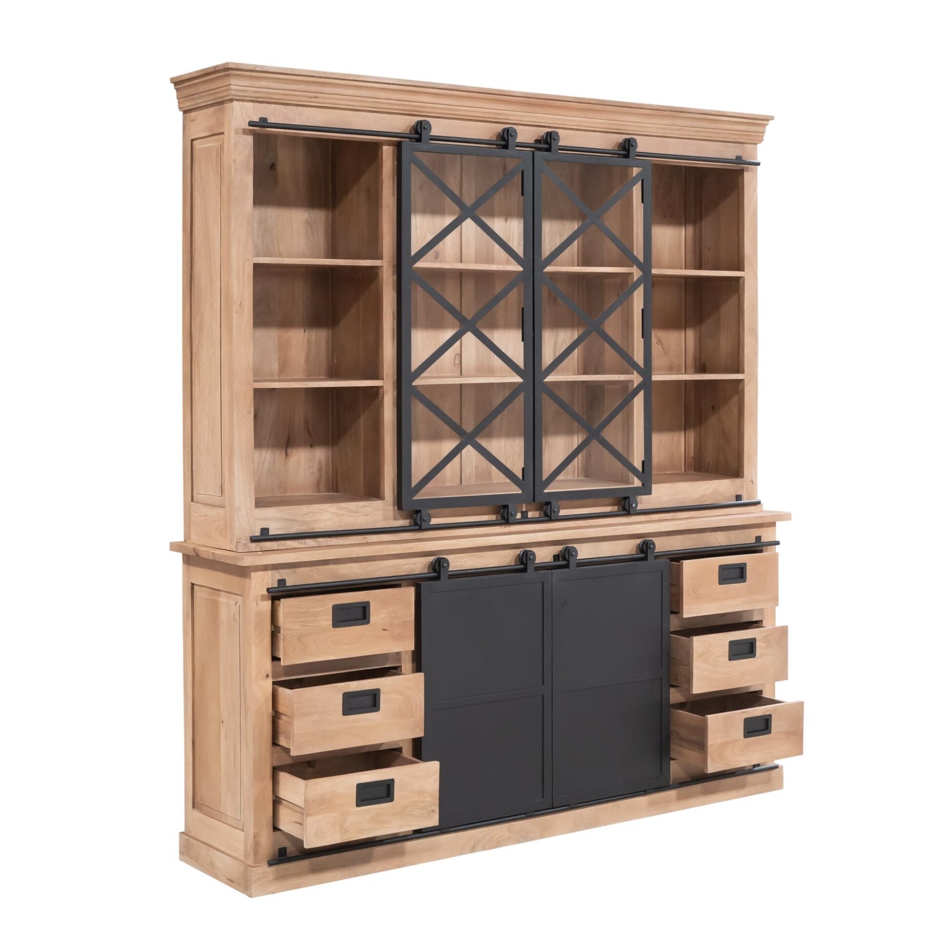 Vitrinekast Fresno XXL is een stijlvolle combinatie van mangohout met een lichte finish en zwart metaal. Het natuurlijke hout en de zwarte details geven dit meubel een stoere, warme uitstraling die perfect past in elk modern interieur.