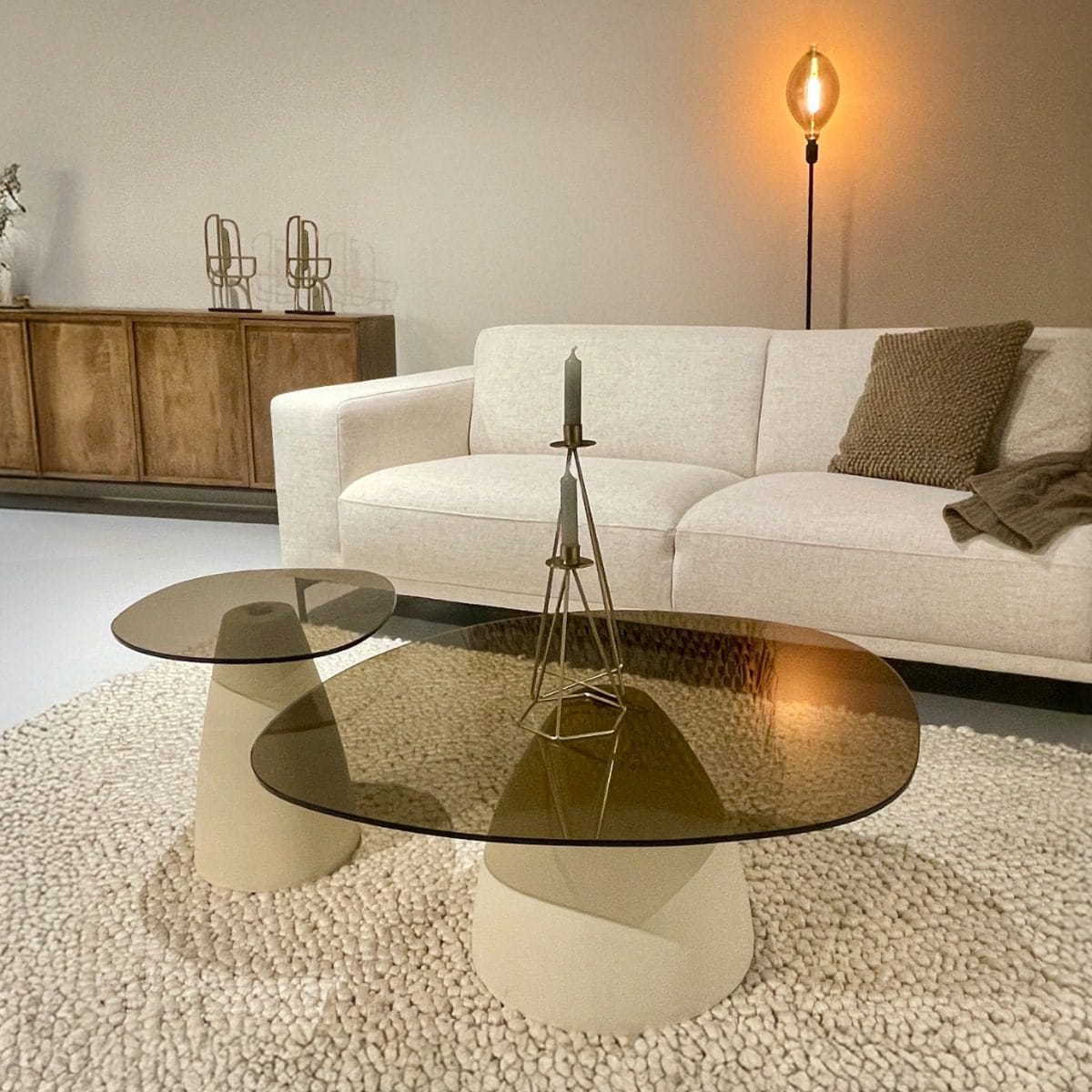 De Brix Mylon salontafels combineren elegantie met moderne materialen. Vervaardigd van rookglas, wat een verfijnde uitstraling geeft, en ondersteund door een stalen poot die is afgewerkt in een stijlvolle ivoorkleurige coating. Mylon is perfecte mix van hedendaags design en duurzame materialen, waardoor ze zowel functioneel als esthetisch aantrekkelijk zijn voor elk interieur.