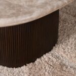 Salontafel Noel is gemaakt van mangohout in de kleur bruin en heeft een blad van marmer. Het ovale marmeren blad rust op een brede, afgeronde voet met verticale groeven in het hout. Het contrast tussen het donkere hout en het grijze marmer geeft de tafel een karakteristieke uitstraling.