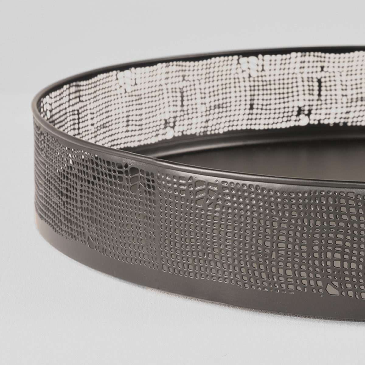 Set Dienbladen van LABEL51 in zwart metaal. Deze stijlvolle set bestaand uit twee dienbladen. De opstaande rand heeft een mooie opengewerkte structuur en is voorzien van handige handvatten. Het opengewerkte patroon is geinspireerd op de structuur van grof geweven jute. Gebruik de dienbladen bijvoorbeeld tijdens een gezellige high tea of borrel of laat ze juist pronken als decoratie op tafel.